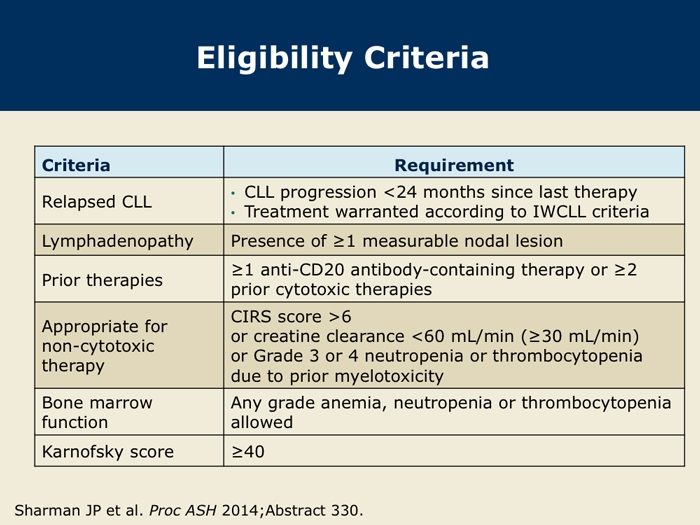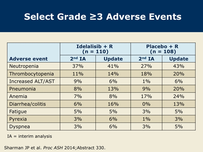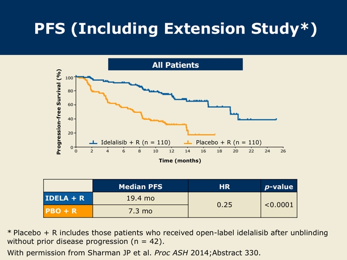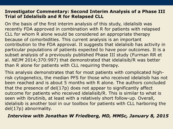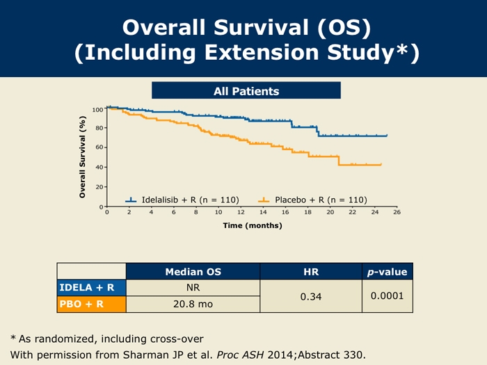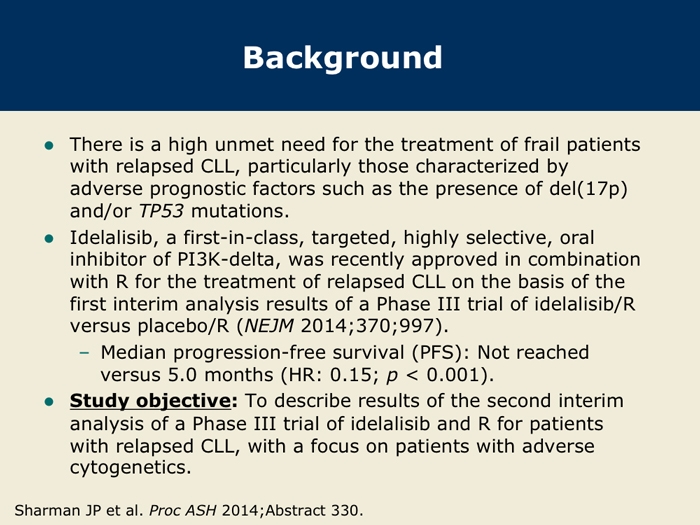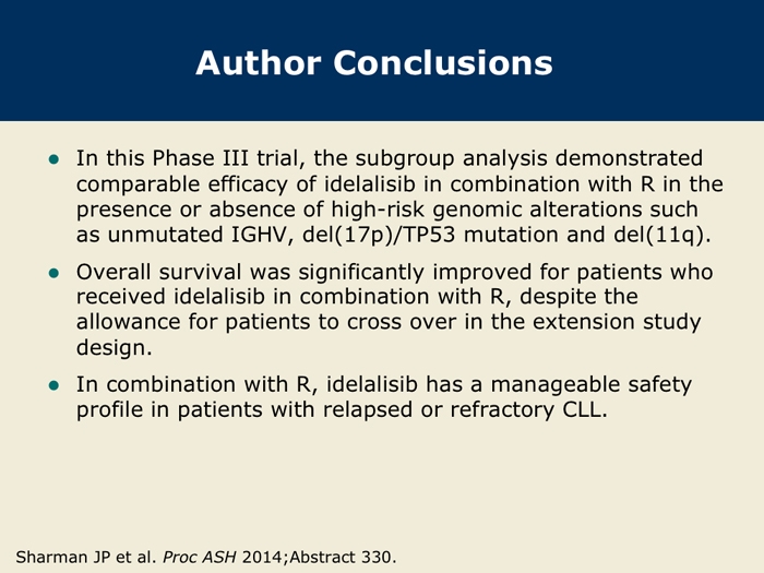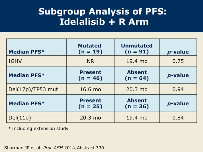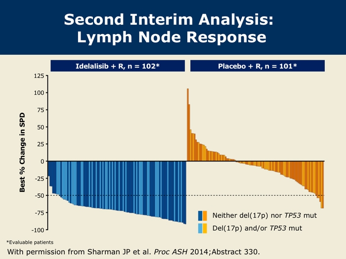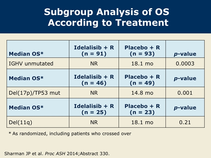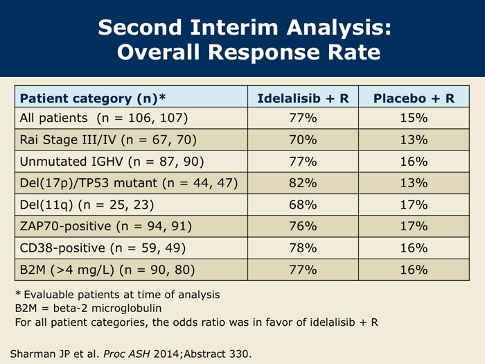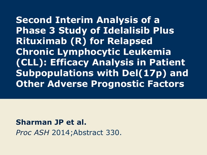Sharman J et al. Second interim analysis of a phase 3 study of idelalisib (Zydelig) plus rituximab for relapsed chronic lymphocytic leukemia: Efficacy analysis in patient subpopulations with del(17p) and other adverse prognostic factors. Proc ASH 2014;Abstract 330.